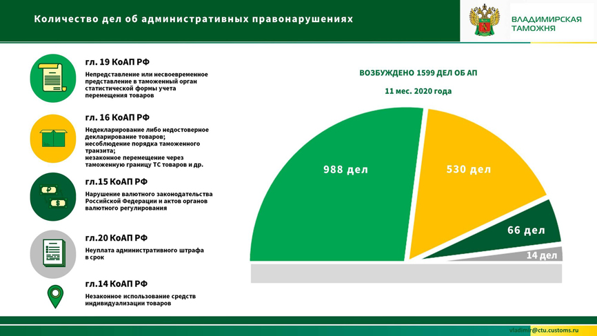 За 11 месяцев 2020 года Владимирской таможней возбуждено 1599 дел об административных правонарушениях.