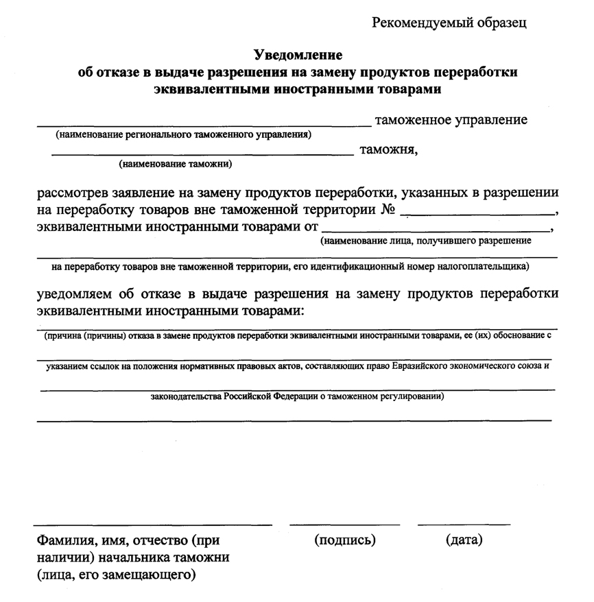 Порядок уведомления лица, получившего разрешение на переработку товаров вне таможенной территории для осуществления операций по гарантийному (безвозмездному) ремонту, об отказе в выдаче разрешения на замену продуктов переработки эквивалентными иностранными товарами